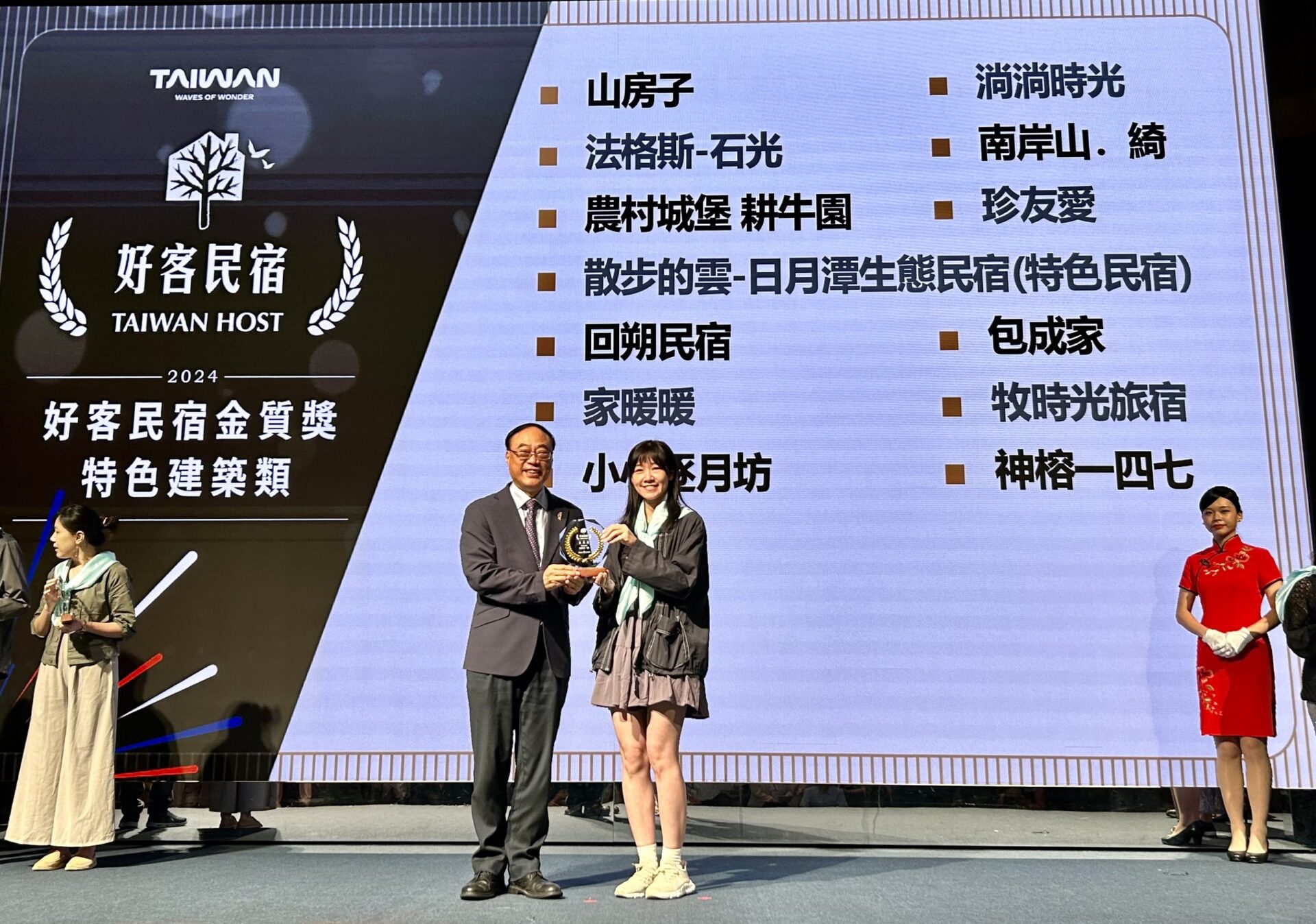 嘉義市業者領獎。本次獲獎的5家業者各具特色,五柳園民宿位在休閒農場內,以檜木、針葉五木等木材為主建材,讓旅客徜徉自然與木質香氣懷抱,感受木都之美;小小逐月坊位在市區巷弄,是嘉義少數的木造民宿之一,保留了嘉義市過去木都元素;家暖暖是嘉義市首間三合院民宿,民宿裡美麗的中庭和獨立空間,帶給旅客賓至如歸的感覺;淌淌時光及回朔民宿都是50年代的老屋重新翻修,保留台灣早期建築元素,讓旅客踏入建築就能感受到既傳統又摩登的潮風格。