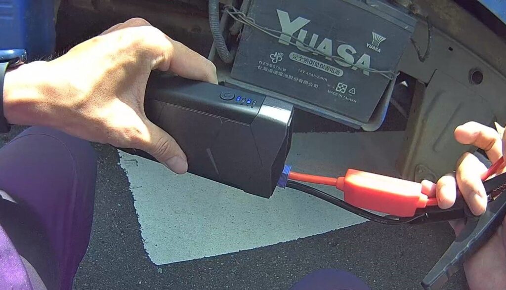 ▲中興分局員警用行動電源「電霸」,協助攤商發動貨車,解決「刁車」問題。(圖/中興警分局提供)