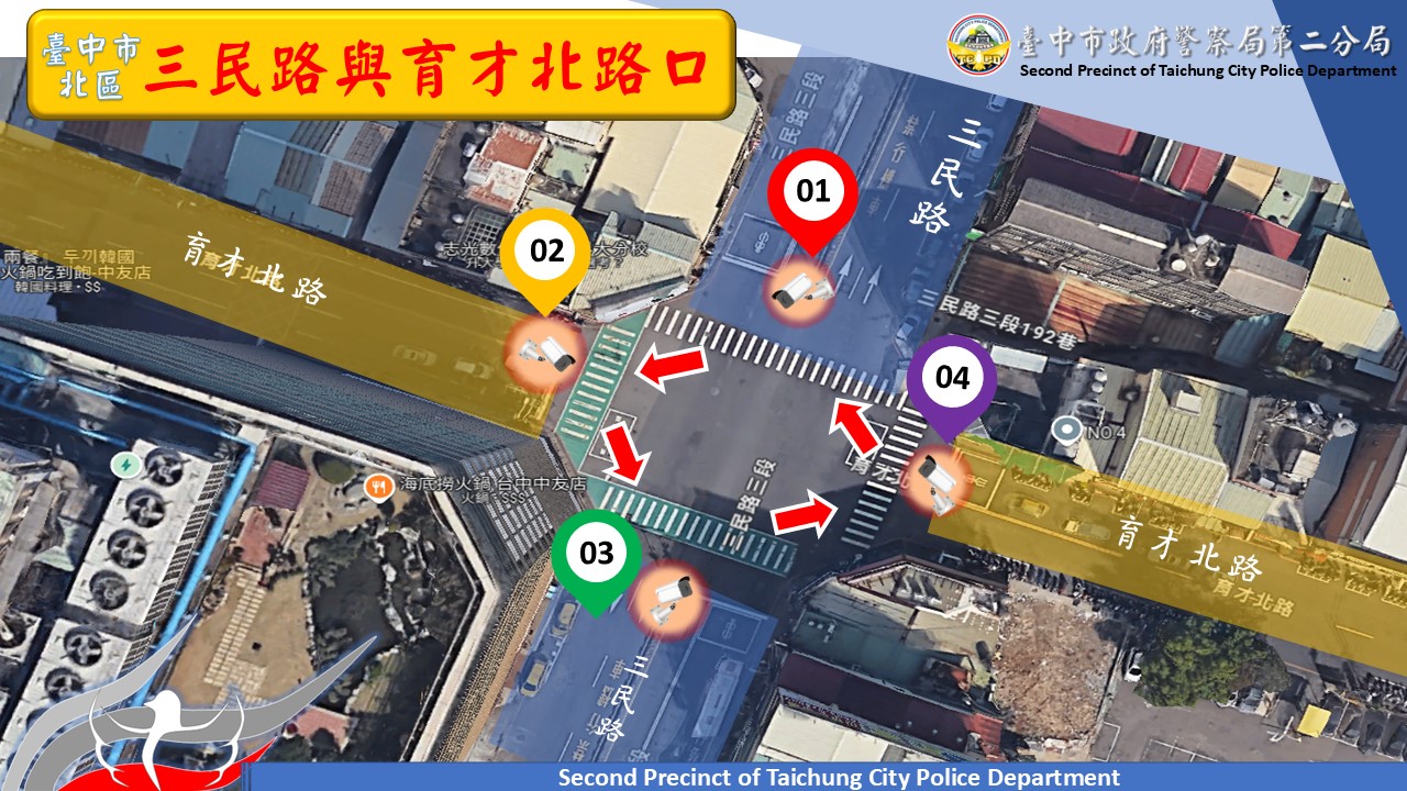 台中市警察局表示,台中市北區三民路與育才北路口,鄰近一中商圈、中友百貨,加上周邊有臺中科技大學、臺灣體育大學、中國醫藥大學、台中一中及新民高中等多所院校林立,行人穿越密集,車流量大,中市警二分局統計三民路與育才北路口112年共發生交通事故46件,造成37人受傷。