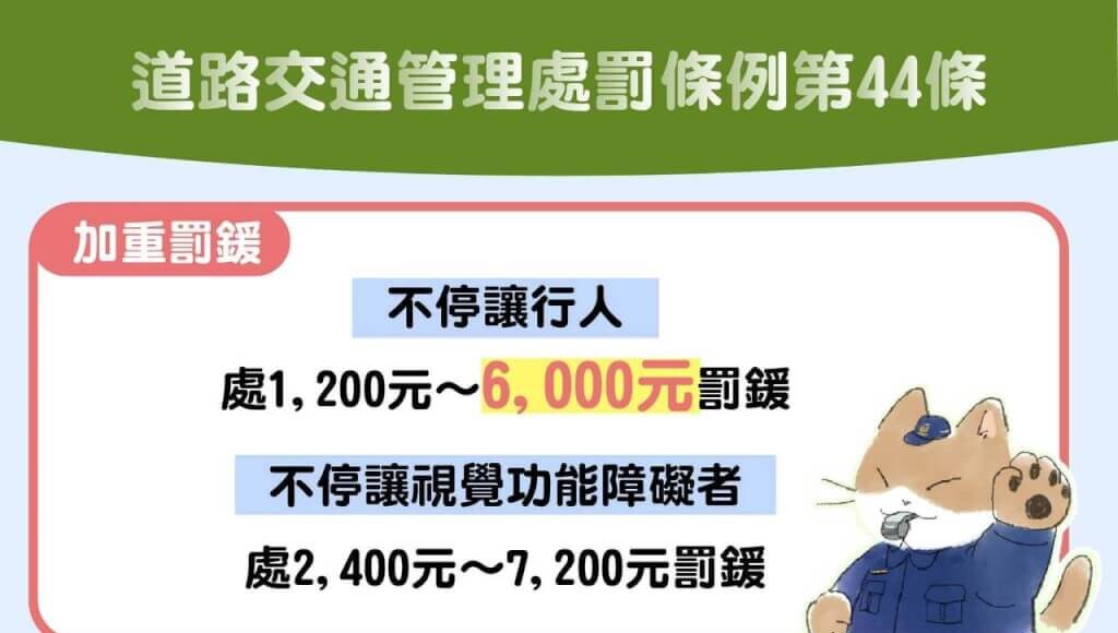警方表示,不停讓行人取締標準為汽機車行近行人穿越道,若距離行人行進方向不足3公尺(約1個車道寬或3組枕木紋)及車頭(前輪)已進入行穿線,距離行人行進方向不足3公尺,即構成違規取締要件,依據道路交通管理處罰條例第44條第2項規定,機車處1200元罰鍰,汽車處6,000元罰緩,另外還要違規記點3點及接受3小時道安講習。其中,若因不停讓行人而肇事致人受傷或死亡,處7200元以上3萬6000元以下罰鍰,致人受傷者吊扣駕照一年;致人重傷或死亡者,吊銷駕照。
