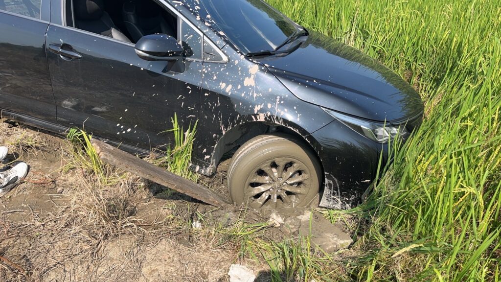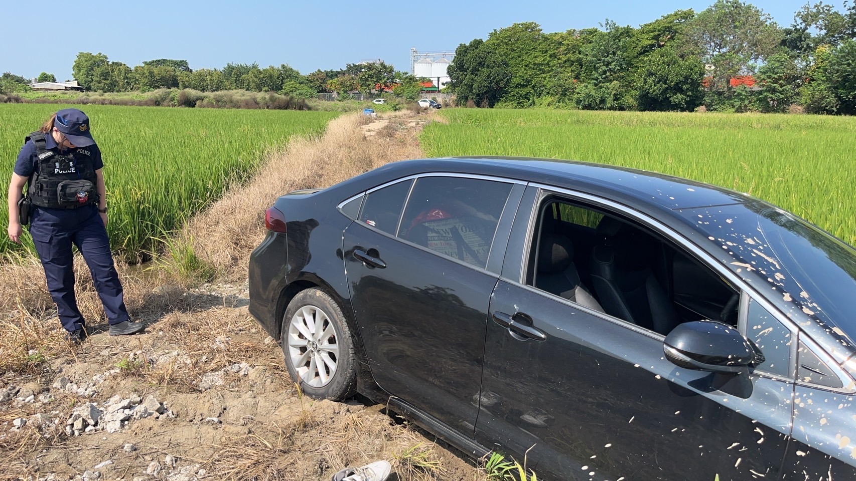 【記者爆料網 周庭慶/苗栗報導】昨(15)日中午11時許,苗栗縣頭份分局獲報,轄內中華路352巷底有車輛掉入田裡,尖山派出所警員黃士宸、張芷妍前往處理,發現1輛黑色自小客車車頭掉入田中,29歲李姓男子試圖將車輛駛離。