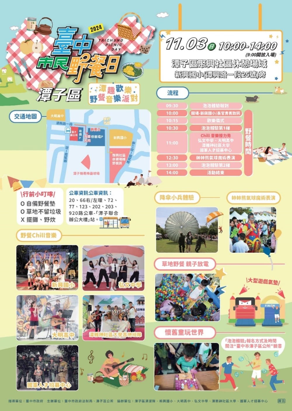 台中市民野餐日自111年起於中央公園舉辦,去年擴大為「山海屯城」四地連線,今年第3屆再次擴大,將於11月3日(星期日)於台中市29個行政區串連盛大舉行。法制局表示,此次與潭子區公所攜手於聚興社區休憩場域(新興國小 潭興路一段25號旁)共同規劃辦理潭子區市民野餐活動,配合「野餐充電、草地放電」主題,獨家邀請國軍人才招募中心設置「降傘小兵活動區」,讓市民實際體驗乘風「飛奔」的感覺!