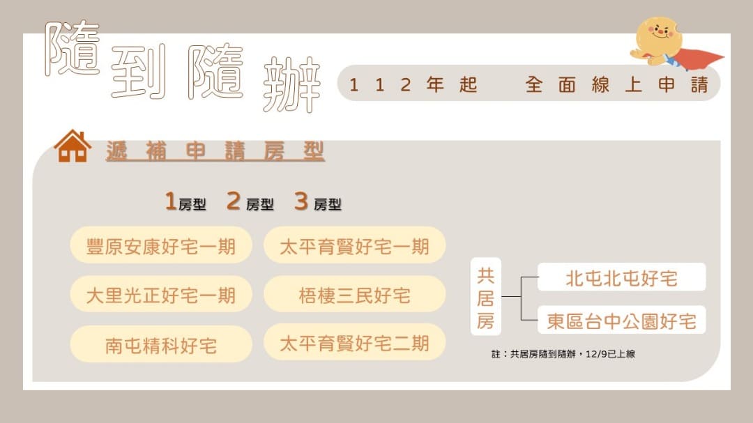 台中市住宅處說明,112年起開放民眾線上申請候補社宅,目前已有豐原區安康段一期、大里區光正段一期、南屯區精密機械科技創新園區、太平區育賢段一期、梧棲區三民段及太平區育賢段二期等6處基地,開放隨到隨辦常態受理申請作業。為讓民眾能更即時查詢目前各社宅隨到隨辦遞補情形,即日起只要到「台中市社會住宅17租」一站式入口網,即可查詢所有社宅遞補情形,登入後可進一步查詢申請人個人遞補序號。