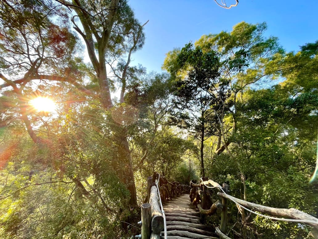 接著,沿著林間小徑走在相思林間,來到0.6K心情放空站,這裡除了涼亭可以休息,還有拉筋設施可以舒緩一下緊繃的肌肉;舒緩後上行來到0.9K心情調適站,此時已完成一半路程,心情十分愉悅,另一種形式的拉筋板,剛好舒緩微酸的小腿後再出發,會經過一段大魔王級上下坡,來到1.1K心跳體驗站,再經過一段上下坡,感受穿梭充滿蕨類植物的茂密山林,來到1.4K幽谷環境站,這環境優美,可以眺望山林美景,再往前來到1.5K乳酸集結站,會有種全身熱氣爆發的感覺,最後走到終點-逍遙自在站,在逍遙亭遠眺群山環抱的美景,十分放鬆舒坦,1號健身步道不容小覷,揮汗淋漓,實測來回一趟燃燒卡路里達700大卡。