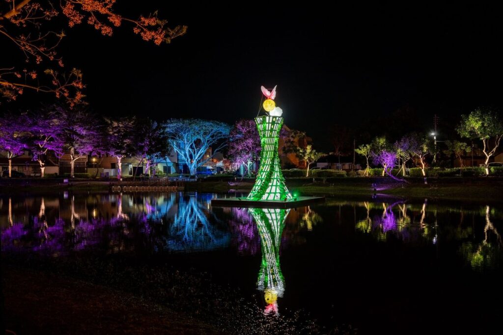 文化局代理局長林韋旭說明,今年策展扣合主題「光的年輪」,呈現累積15年來的感動與創作深度。亮點作品包括位於藝術燈區的主燈《無盡光輪》,由知名藝術團隊「UxU Design 有用主張」創作;另有水幕投影作品《光的年輪》由黑川互動媒體藝術操刀;而禹禹藝術工作室的作品《光聚》、先驗物件的《花火城邦》、日本藝術家森岡厚次《又一個月圓》……等。與以往不同的是,今年新闢公19口袋公園,依現地自然環境設置4件植物意象的《榮光幻花》作品,以臺灣常見的姑婆芋、蕉葉、蒲公英、野花造型,利用金屬轉譯,以巨型花朵雕塑與光環境打造一座童話般的夢幻花園。