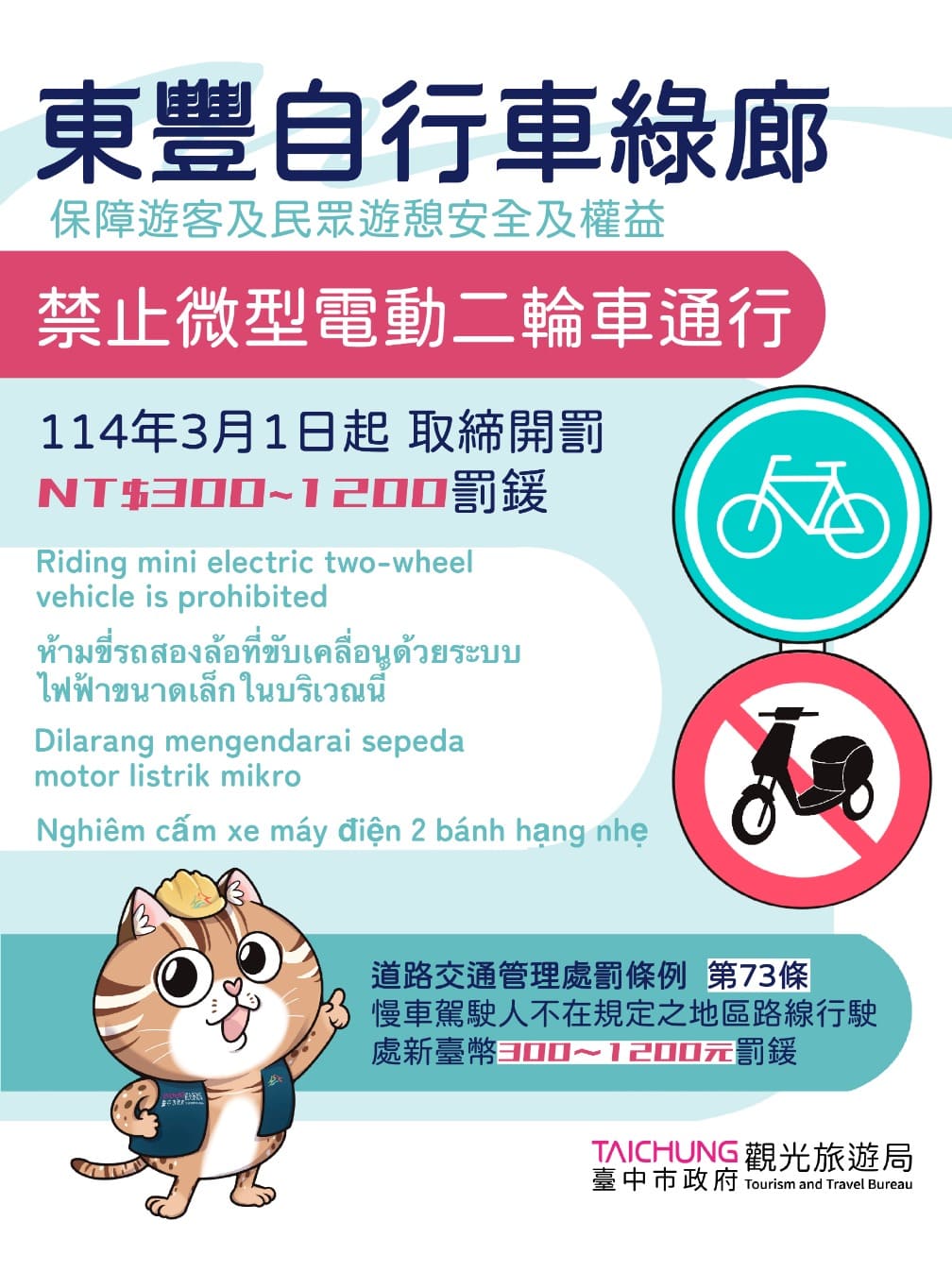 觀旅局長陳美秀表示,東豐自行車綠廊與后豐鐵馬道為台中市熱門的休閒自行車路線,每年吸引大量遊客騎乘單車、享受自然美景。然而,近年來微型電動二輪車數量增加,部分車輛車速較快,影響自行車騎乘安全。為維護道路使用安全,台中市政府依據「道路交通管理處罰條例」第5條規定,正式公告禁止微型電動二輪車進入上述兩條自行車道,警方將依據「道路交通管理處罰條例規定」第73條取締開罰,違規者將處以新台幣300~1200元罰鍰,請民眾遵守法令,以免受罰。