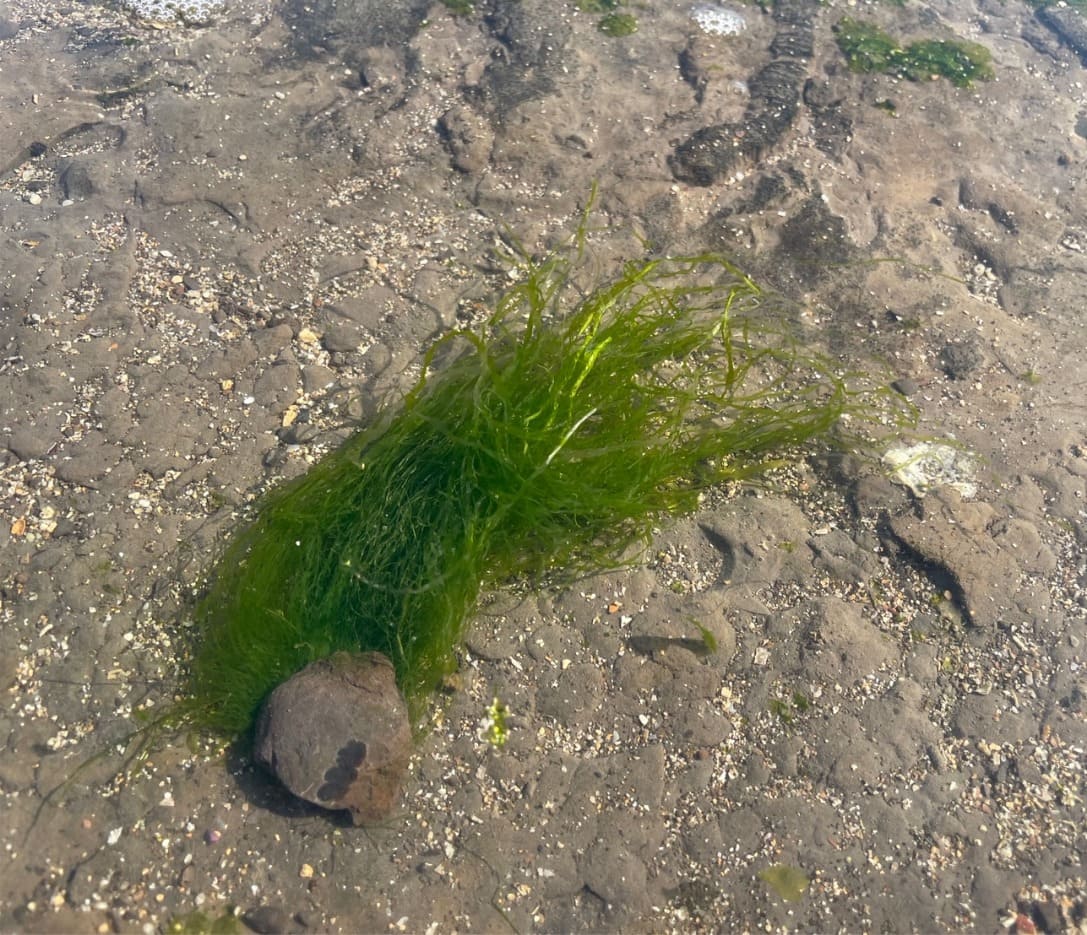 在東北角潮間帶生長著許多藻類,依照顏色可以簡單分類成綠藻、紅藻及褐藻,其中綠藻就包含了台灣沿岸常見的礁膜、石蓴及滸苔等代表性藻類,三者雖同屬綠藻,但在外觀、生態功能與生長環境上各具特色。「礁膜」又稱青海菜或鵝仔菜,藻體呈黃綠色或淡綠色,薄而透明,邊緣帶有波浪狀皺褶,觸感柔滑,主要生長於潮間帶上部的靜水區,如岩壁或潮池內,由於礁膜只有一層細胞,故口感細軟柔嫩,是饕客的最愛的海鮮美味。「石蓴」呈薄葉狀,色澤由草綠至深綠,邊緣可能不規則裂開,可耐受強光及潮間帶乾濕變化,故多生長於潮間帶中部至低潮線附近,常在海蝕平台形成大片「綠色草原」景觀,位於石門區的老梅綠石槽,便是由石蓴及其他綠藻形成的特殊景觀,雖然石蓴可食用,但質地較粗,多用作飼料或肥料。「滸苔」為中空管狀,色澤鮮綠,形似壓扁的吸管,生長快速,廣泛分布於潮間帶、河口、紅樹林及養殖池等營養鹽豐富的環境,全年可見,可食用或做成水餃餡,烘乾後具有濃郁獨特香氣,亦可做為釣餌使用。這三種綠藻不僅在海洋生態系統中扮演重要角色,也與沿海居民的生活息息相關。