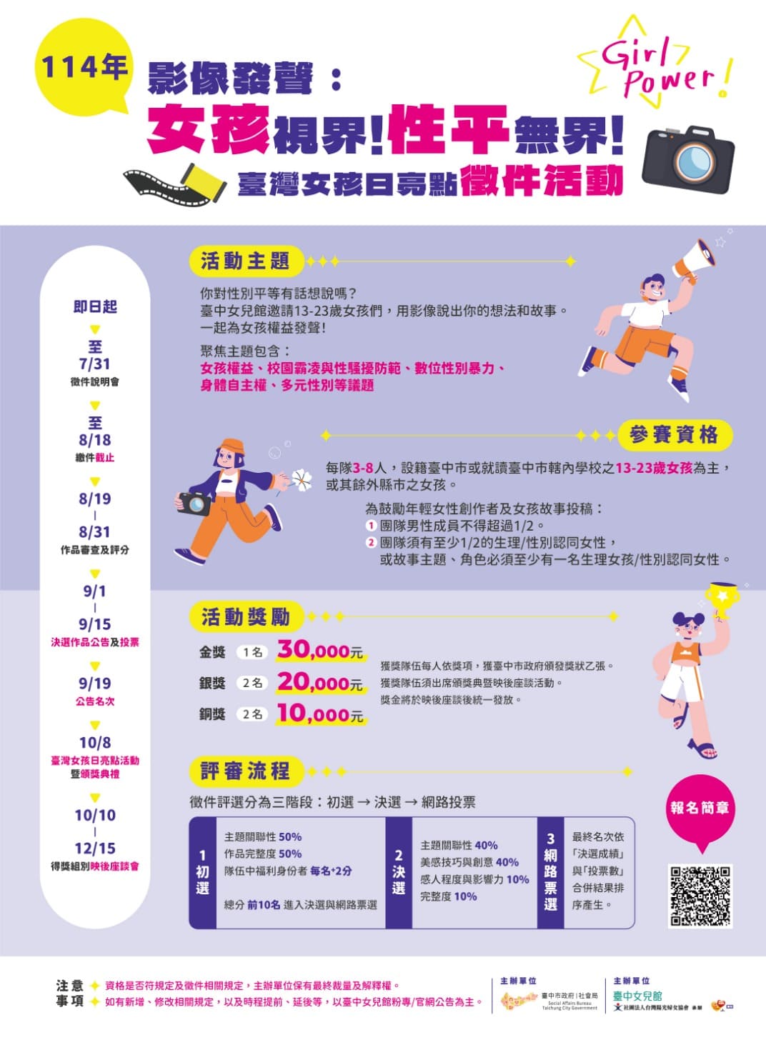 社會局說明,透過評審決選及網路投票,將選出1名金獎、2名銀獎及2名銅獎,總獎金高達9萬元。除了頒獎典禮,10月到12月間也預計舉辦映後座談,鼓勵女孩勇於表達自我與交流。社會局持續落實《消除對婦女一切形式歧視公約》(CEDAW)及SDG5「實現性別平等並賦予女性權力」,致力打造讓女孩安心成長、自信發聲的城市。徵件活動詳情與報名資訊可參考台中女兒館官網(https://www.twtcgirls.com);更多性別平等資訊歡迎瀏覽台中市政府性別平等專區(https://ge.taichung.gov.tw/index.aspx)。