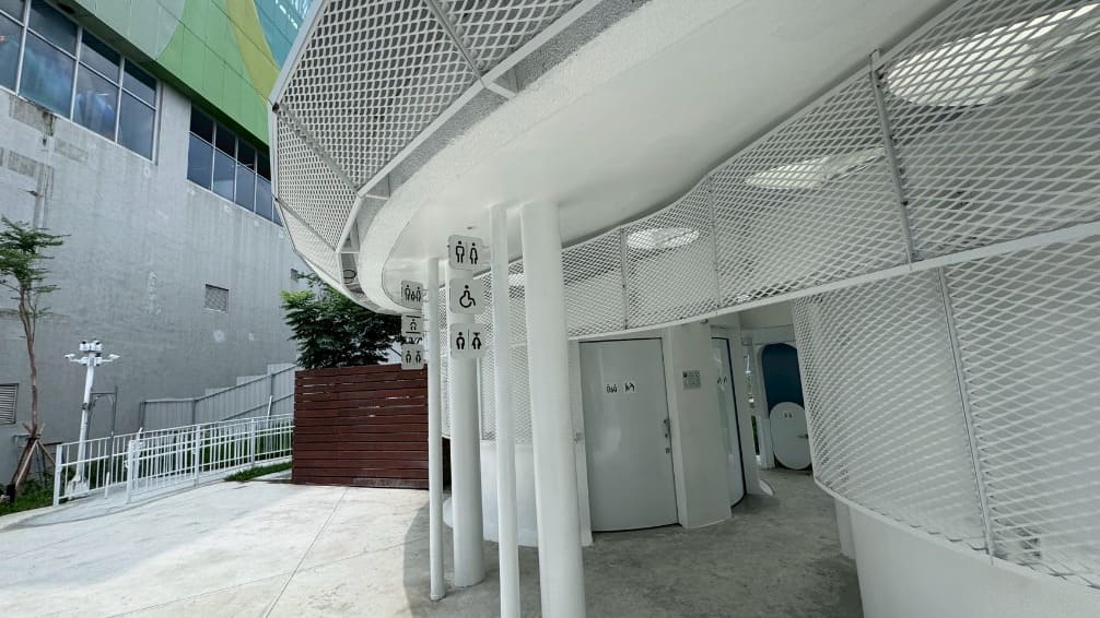 另外,在管理維運方面,導入物聯網(IoT)智慧系統,即時監控衛生紙、洗手乳等耗材使用情形,並透過LINE推播通知清潔人員補充,提升效率。同時具備「久待示警功能」,若使用者逗留過久,系統會通知管理員前往關懷。廁所亦設智慧感測器,能監測空氣品質、溫濕度與人流狀況,並依數據自動啟動強制排風,改善異味與濕氣,打造舒適如廁環境。
