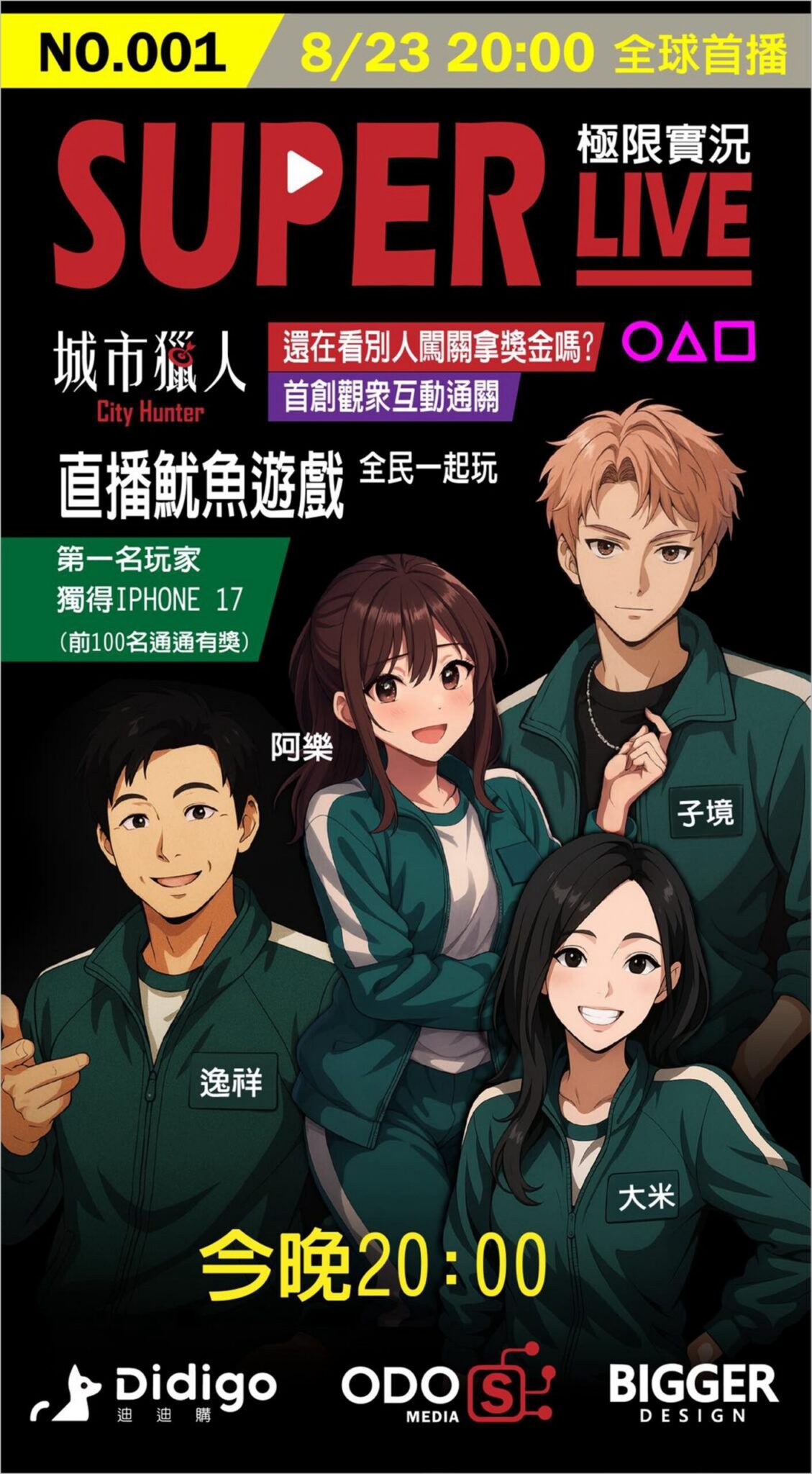 由DIDIGO 迪迪購 帶來的OMO 遊戲 [城市獵人] x BIGGER DESIGN x NETFLIX《魷魚遊戲》授權聯名,ODOS MEDIA 奧達傳媒 打造全球唯一互動式闖關直播!【SUPERLIVE 極限實況 前導篇】即將於8/23進行全球首錄, 首創直播主與觀眾互動闖關,帶來最夯的人氣《魷魚遊戲》全民一起玩! 8/23 晚上 8 點開放入場,跟明星們一起生存下去,快關注迪迪購官方TIKTOK https://www.tiktok.com/@didigo.app