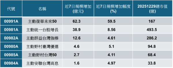 台股主動式ETF 新兵:復華未來50(00991A)再創佳績,受惠行情走高及市場買盤推升,自 12/18掛牌上市後短短7個交易日(截至 12/29),基金總規模由成立時的108 億元擴增至167億元,增加62億元、增幅近6成,成為近期最受市場資金青睞的台股主動式ETF。