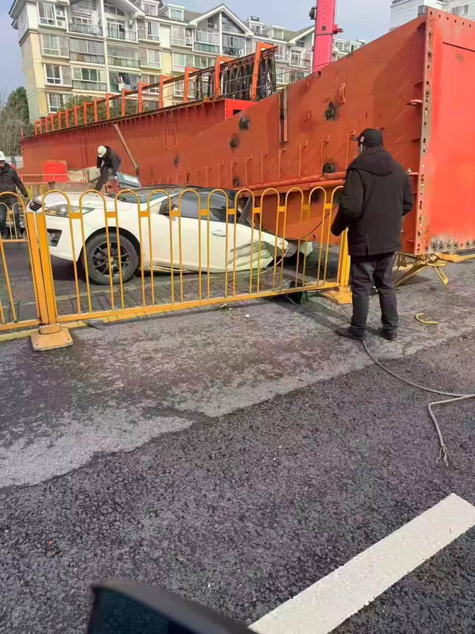起重機同時砸中在白色轎車後面行駛的一輛黑色SUV。黑色SUV車主韋先生指出,1日上午11時16分許,他正常行駛在後湖大道往金橋大道方向,路過一處地鐵工地時,起重機突然傾倒,擦過他所駕駛車輛的車頭,導致車頭部分損毀嚴重。