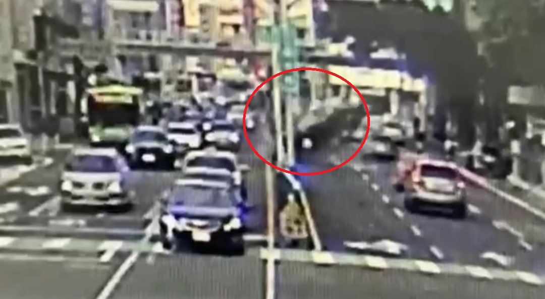 自小客車失控暴衝撞安全島再撞路旁石墩(紅圈處)。翻攝畫面